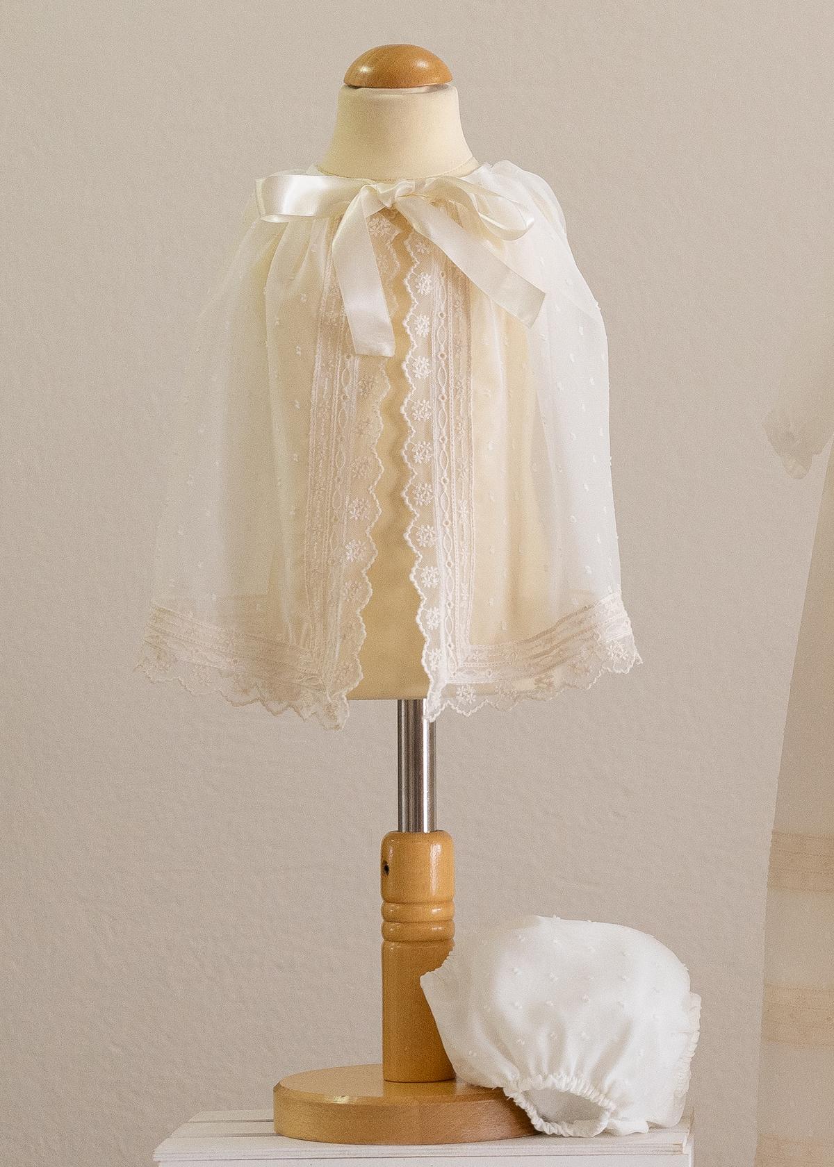 Preciosa Capa de Bautizo que se encuentra en nuestra Colección Bautizo, modelo 70001, confeccionado en Organza Plumeti Bordado de muy alta calidad de color marfil. FABRICADO EN ESPAÑA.