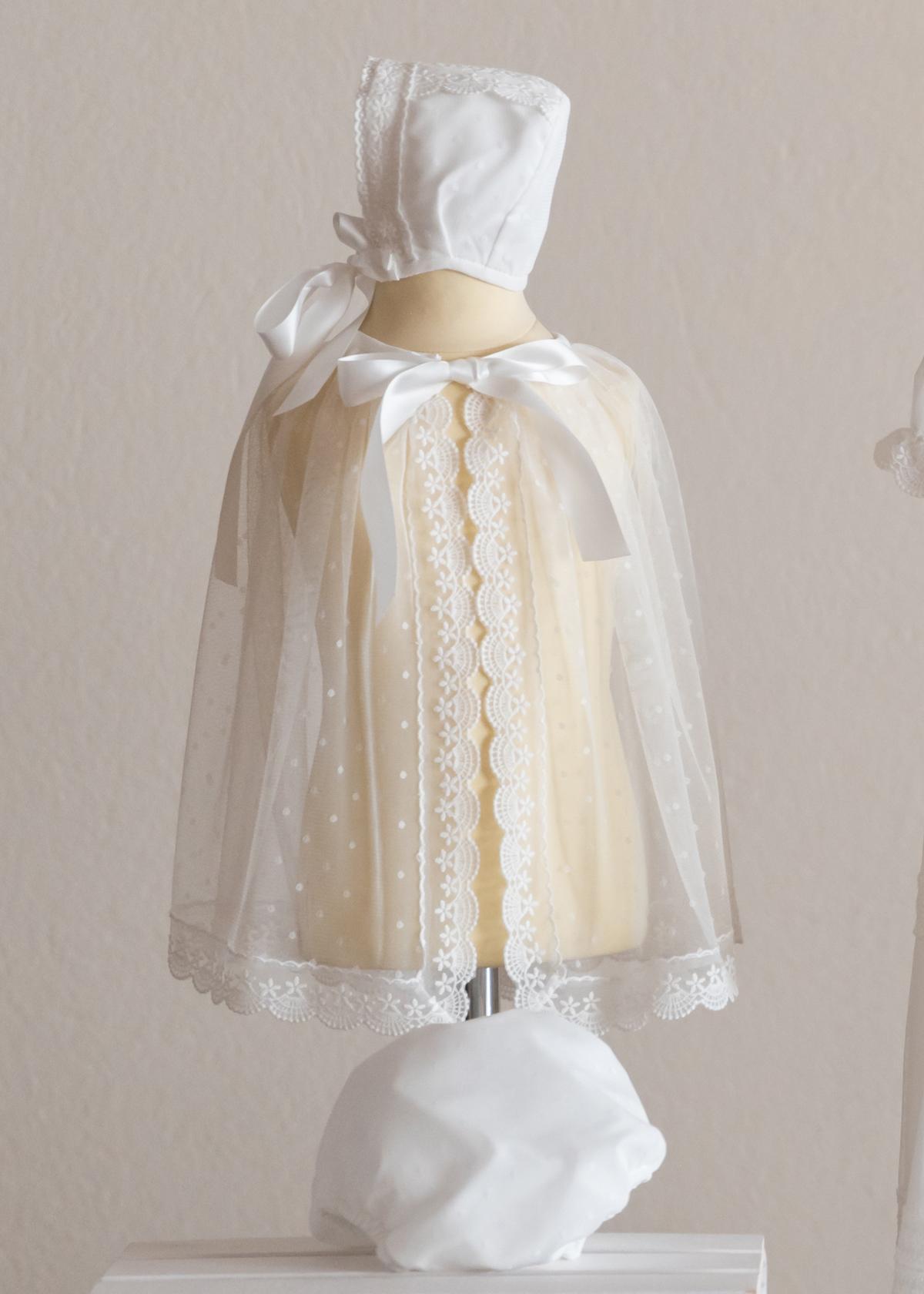 Preciosa Capa para bautizo que se encuentra dentro de nuestra Colección Bautizo, confeccionado en tul bordado de muy alta calidad de color marfil. FABRICADO EN ESPAÑA.