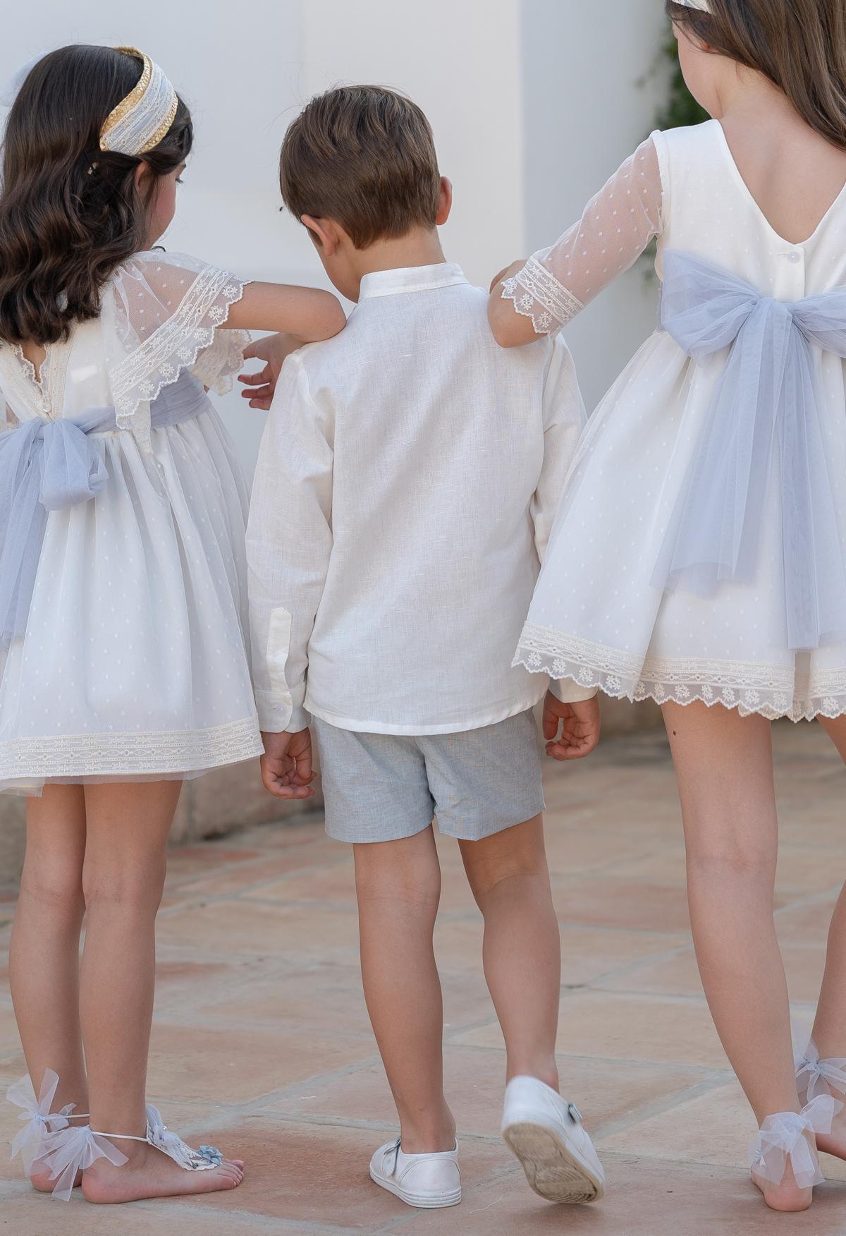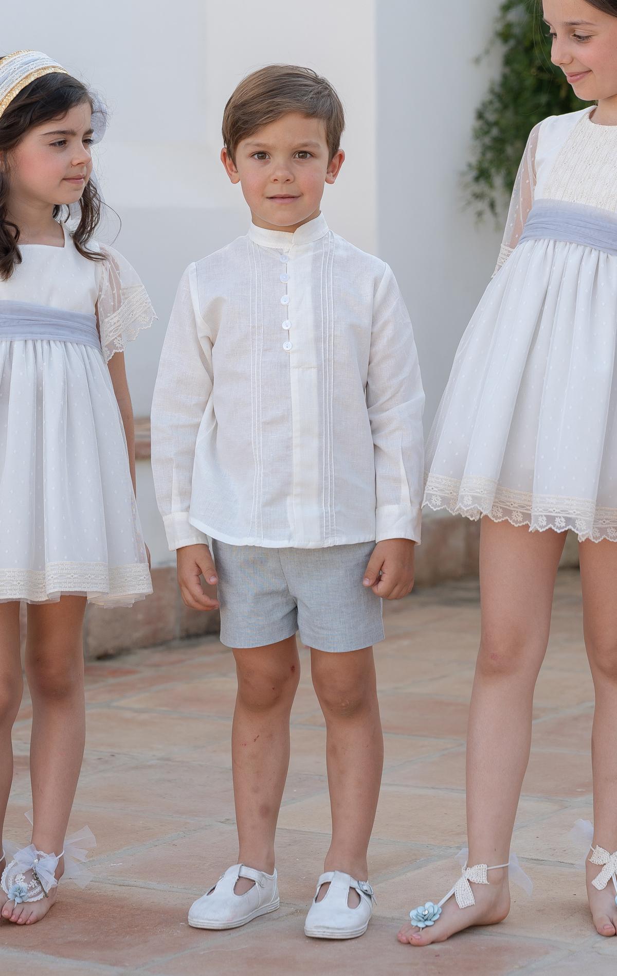 Precioso conjunto perfecto para Ceremonia y Arras y también para Bautizo, compuesto por camisa con cuello mao con jaretas y abotonada hasta el pecho confeccionada en lino color crudo y pantalón basico con cinturilla ajustable de lino . Es un modelo de continuidad que esta disponible durante todo el año. Perfecto para combinar con la misma familia de vestidos de niña. Fabricado en España.