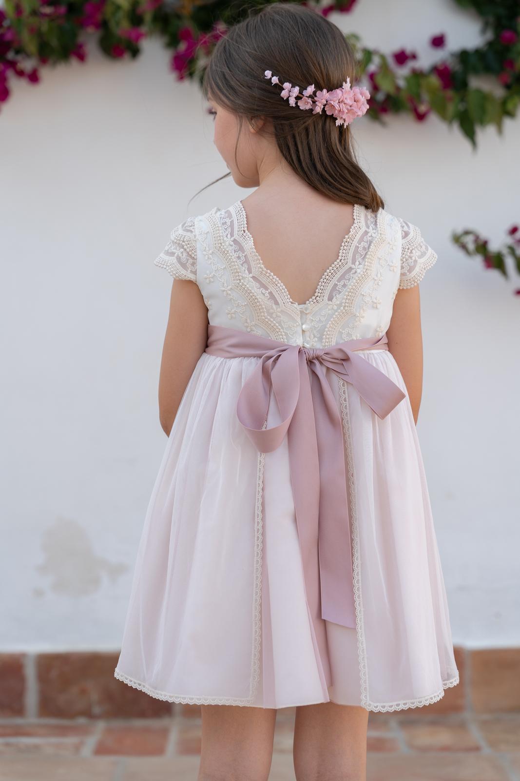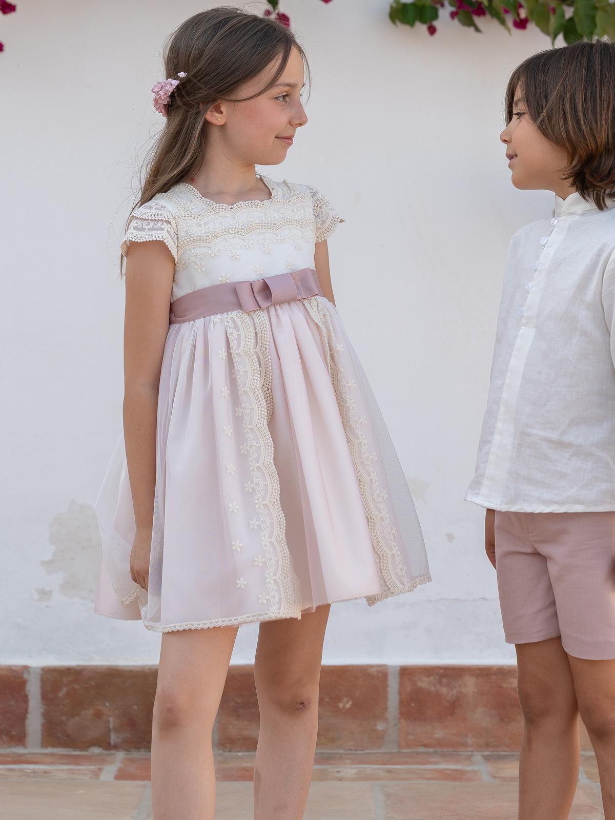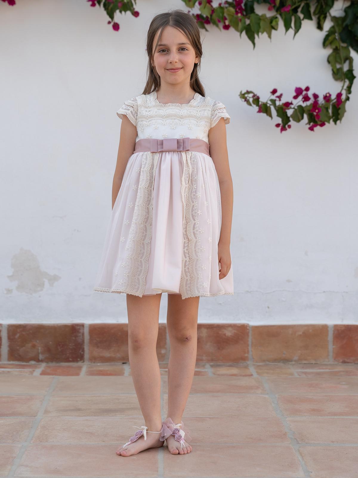 Vestido manga corta para ceremonia arras de niña de la nueva colección de la firma española  Eva Martinez, Colección Lina, en el largo CBG lleva incluida la braguita, confeccionado en tul con bordados y puntillas donde destaca el corte de la falda, tiene fajín a contraste de color.. FABRICADO EN ESPAÑA. Medidas en la Descripción.