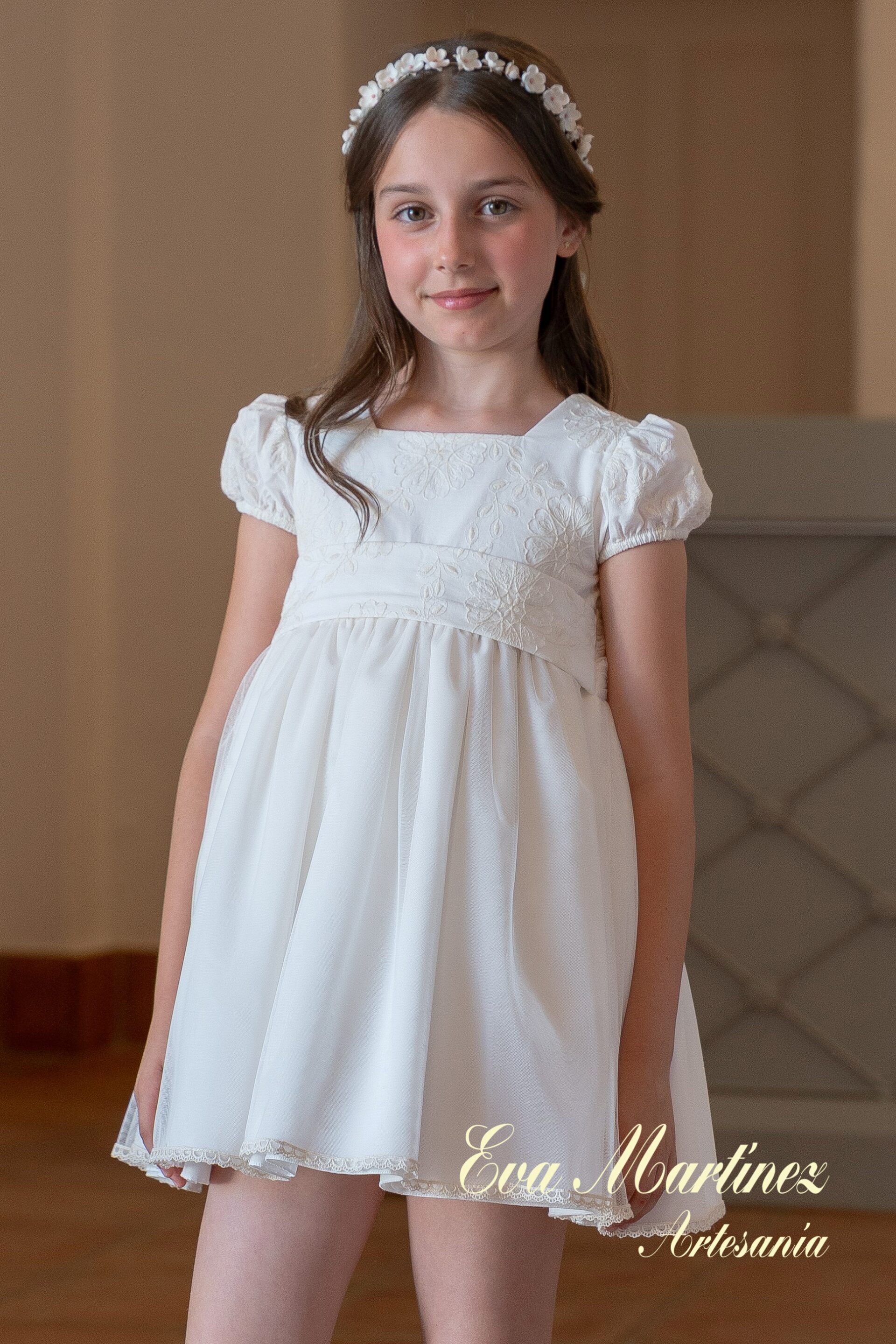 Vestido para ceremonia y arras de niña de la nueva colección de la firma española Eva Martinez 2026, modelo de la familia Miccaela, en el largo CBG lleva incluida la braguita, confeccionado tul bordado para el cuerpo y liso para la falda de manga corta con fajín de tul a contraste. FABRICADO EN ESPAÑA. Medidas en la Descripción
